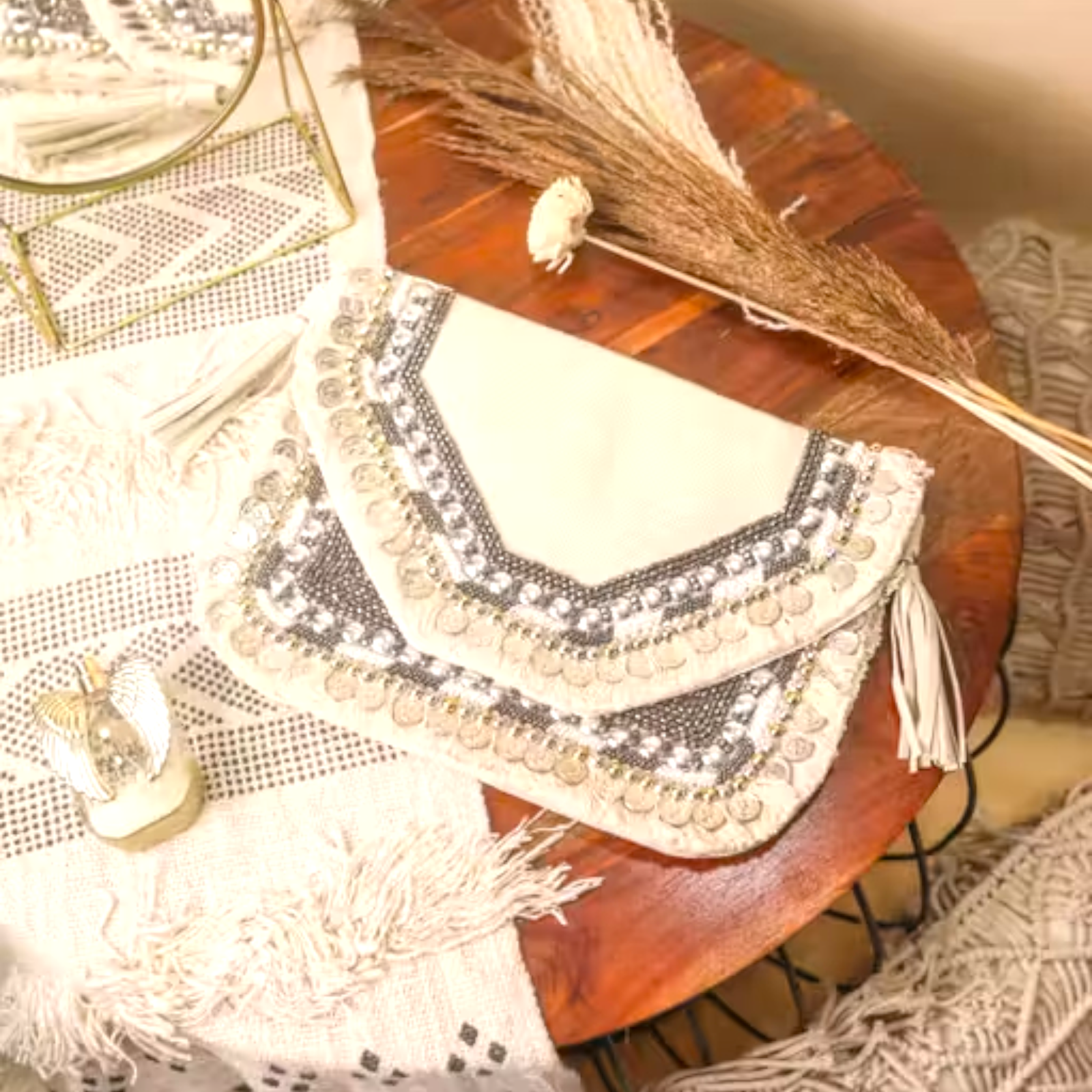 The Boho Jute Bag with Silver Handwork & Sling Option is the perfect fusion of practicality and style. Crafted from durable jute, this bag is not only eco-friendly but also a versatile addition to your wardrobe. Featuring intricate silver embellishments, it adds a touch of glamour to any outfit. Whether you’re heading to a casual brunch, a shopping spree, or a night out, this bag is your go-to accessory.
