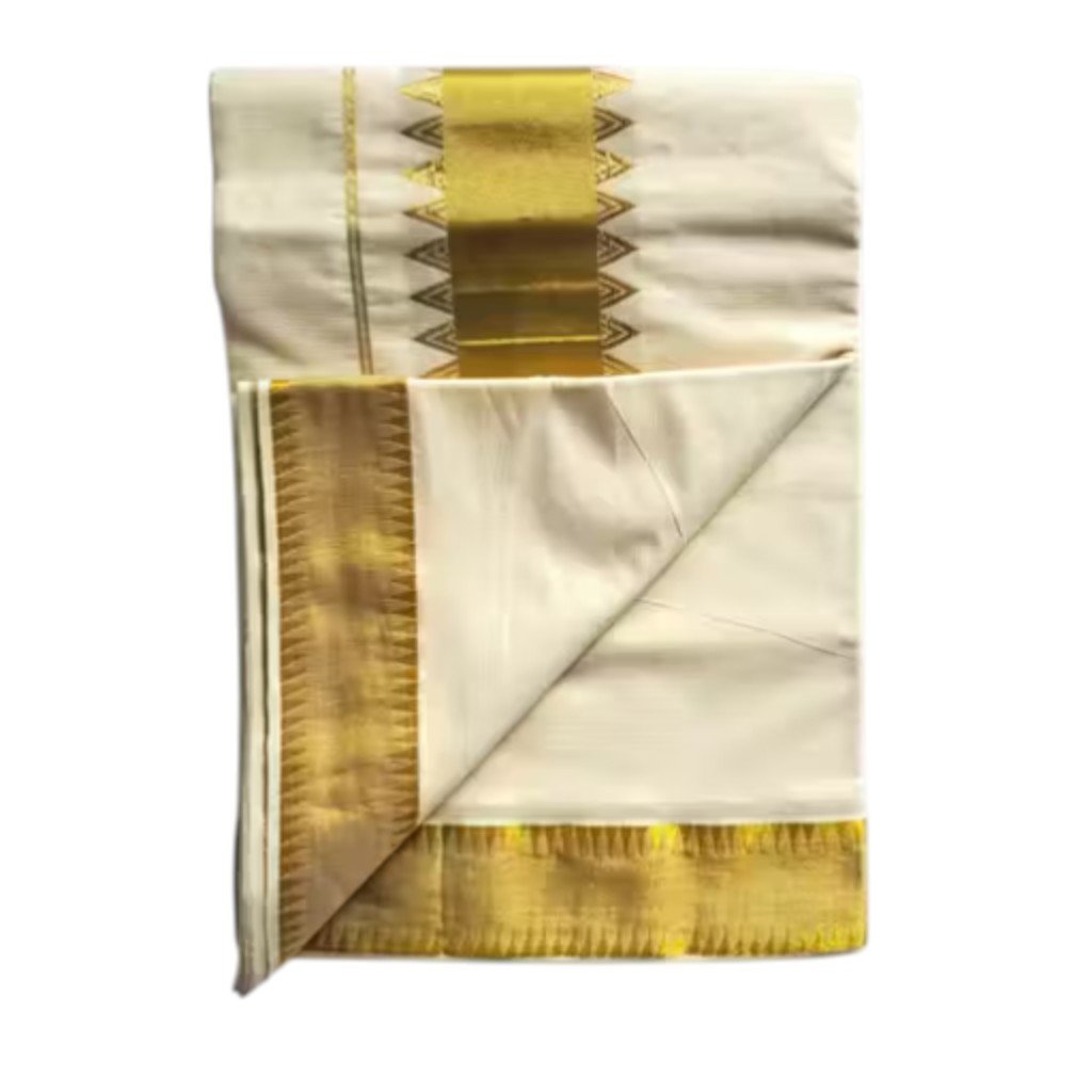 Crafted in classic off-white cotton, the saree reflects the purity and understated beauty that Kerala handloom textiles are loved for. The highlight, of course, is its rich golden zari border. Featuring traditional temple-inspired triangular motifs and textured woven bands, the border adds depth, shine, and unmistakable cultural character without overpowering the minimal aesthetic.
